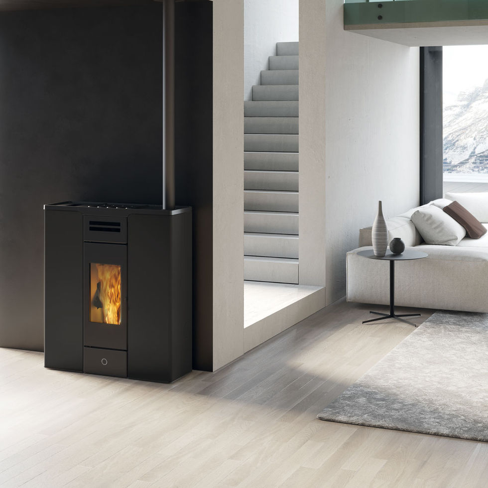 - Sortie des fumées supérieure Ø 8 cm (femelle) : installation esthétique et compacte.
